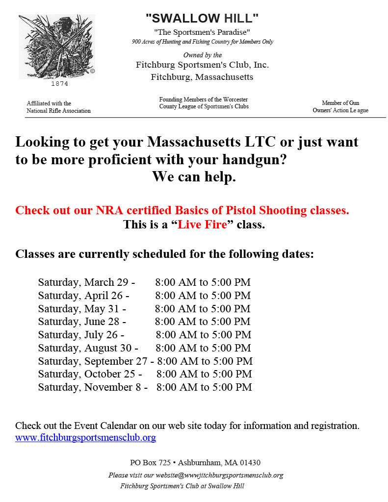 Registration for our 2025 NRA Basics of Pistol Shooting courses is now open. Classes start on Saturday, March 29, 2025 (weather permitting). This class currently qualifies you for the Massachusetts LTC (LTC-002).